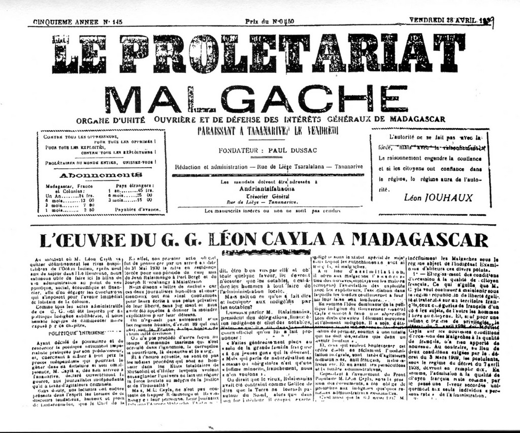 La Troisième Internationale, pour sa part, avait posé l’anticolonialisme comme condition à son adhésion : la rejoindre signifiait appuyer les mouvements libérateurs et cultiver une solidarité entre ouvriers de métropole et travailleurs colonisés. Mais de l’eau a coulé sous les ponts. Le Komintern a une nouvelle ligne, que l’on a observée par ailleurs : le Parti communiste, soucieux de ne pas froisser les radicaux, ne déroge pas à son attitude conciliatrice envers lui. Et ce n’est pas la seule raison. On peut le voir à Madagascar : Paul Dussac, militant anticolonialiste de toujours, tant de fois emprisonné, anime Le Prolétariat malgache, un journal communiste. Mais il reçoit une volée de bois vert en provenance des instances du parti, qui n’admettent pas ses positions « nationalistes » – c’est-à-dire indépendantistes. Au contraire, il faut des revendications minimales – libertés de presse et de réunion, organisations syndicales, lois sociales. Robert Deloche, de la section coloniale du PCF, indique aux militants sur place : « Il serait absolument contre-indiqué de réclamer de ce gouvernement l’indépendance. Ce n’est pas ainsi que ces problèmes se solutionnent. » Il est hors de question de diviser, par une « agitation tapageuse et stérile » : il faut avoir « le plus grand souci du respect de l’ordre et de la légalité ». En aucun cas le Parti ne doit paraître « anti-français » 8. Deloche incarne la ligne impulsée par Moscou : ne pas priver la France de ses colonies, ressources financières et militaires dont elle a besoin pour préparer une éventuelle guerre. C’est une conséquence logique du pacte franco-soviétique. Le gouvernement le confirme : en octobre 1936, Maurice Viollette, ministre des Colonies par intérim lors d’un bref congé de Marius Moutet, demande au gouverneur à Madagascar de ne « tolérer aucune agitation » et de prendre des mesures sérieuses contre les mouvements d’émancipation.