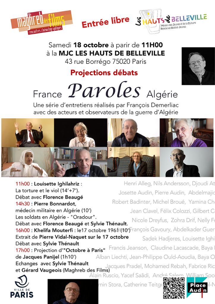 Le Maghreb des films et la MJC des Hauts de Belleville organisent le 18 octobre une journée de projections-débats consacrée à la série Paroles France Algérie du réalisateur François Demerliac.