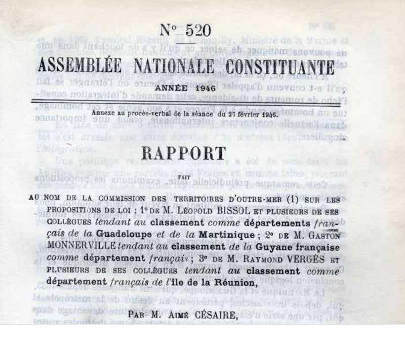 Portée par quatre élus issus de ces territoires, Aimé Césaire (Martinique), Léopold Bissol (Martinique), Gaston Monnerville (Guyane) et Raymond Vergès (La Réunion), la loi départementalisation, au départ nommée « loi assimilation », sera promulguée le 19 mars 1946.