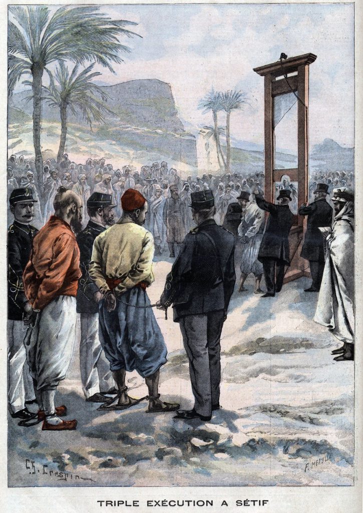 Les exécutions étaient alors publiques, comme c’était partout l’usage. Mais, en métropole, les années passant, on tendit de plus en plus à la discrétion. En Algérie, c’était devenu un spectacle. En août 1904, le Journal des Débats, après une description au ton très détaché d’une triple exécution à Oran (les condamnés avaient assassiné une famille de colons), conclut son article par trois phrases sèches : « À 5 h. 11, le couperet tombe une première fois, une deuxième à 5 h. 12, une troisième à 5 h. 13. Les condamné ont marché résolument au supplice, regardant fixement le couperet. La foule applaudit après la troisième exécution » (3 août 1904). Cette dernière phrase évoque évidemment la population européenne. Mais les indigènes étaient également conviés. Rares étaient les articles de presse qui s’interrogeaient sur leurs réactions. La série continua, avec une seule modification, notable : l’interdiction des exécutions publiques (décret Daladier, 1939)
