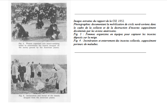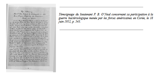 « Par la dispersion délibérée de mouches et d’autres insectes artificiellement infectés par des bactéries contre l’armée populaire coréenne et parmi la population civile de la Corée du Nord, dans l’intention de propager la mort et la maladie, un crime des plus graves et des plus horribles a été perpétré par les forces américaines en Corée, contrairement aux dispositions de la Convention de La Haye concernant les lois et coutumes de la guerre sur terre en 1907, et à la loi universelle interdisant la guerre bactériologique et réaffirmée dans le Protocole de Genève de 1925. […] En utilisant des bombes à gaz toxiques et d’autres substances chimiques parmi la population civile de Corée du Nord, les forces américaines sont coupables d’une violation planifiée et délibérée du Règlement de La Haye de 1907, article 23 (a) et (e) et du Protocole de Genève de 1925.[19]»