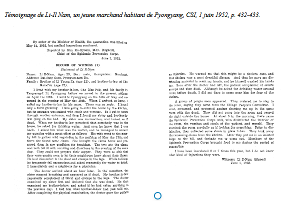 Le jeune marchand Lee-Il Nam raconte également son histoire dans le rapport. En juin 1952, sa sœur et son beau-frère ont été contaminés par le choléra. A l’époque, ils résident a Dai-dong-Goon, à Pyong-an-nam Do, actuelle région de la Corée du Nord. Il explique aux experts de la Commission :