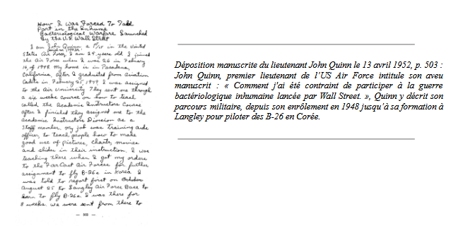 [12] Ibid, CSI, p. 491. « Appendix KK: Testimony of Lt. K. L. Enoch Concerning His Participation in Bacterial Warfare Waged by the American Forces in Korea ».