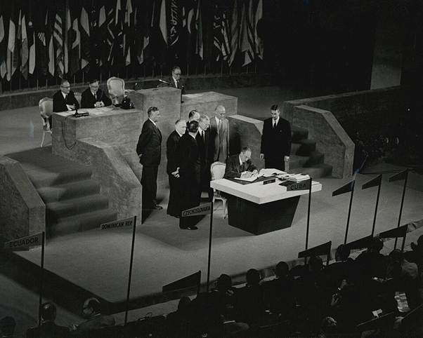 U.S. Department of State, U.S. Secretary of State Dean Acheson signing the Treaty of Peace with Japan, September 8, 1951, 1951, source: Wikimedia commons.