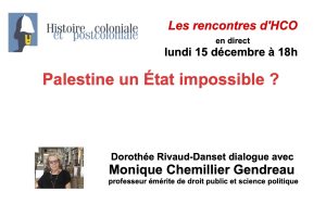 Le 15 décembre à 18 h, pour leur deuxième édition, les Rencontres d’Histoire coloniale et postcoloniale recevront Monique Chemillier-Gendreau, en direct le 15 décembre à 18h, sur le thème « Palestine, un Etat impossible ». Dorothée Rivaud-Danset dialoguera avec Monique Chemillier-Gendreau, professeur émérite de droit public et science politique, qui répondra à vos questions. Ci-après, le lien pour prendre son billet et participer et poser vos question lors de la rencontre en visio.