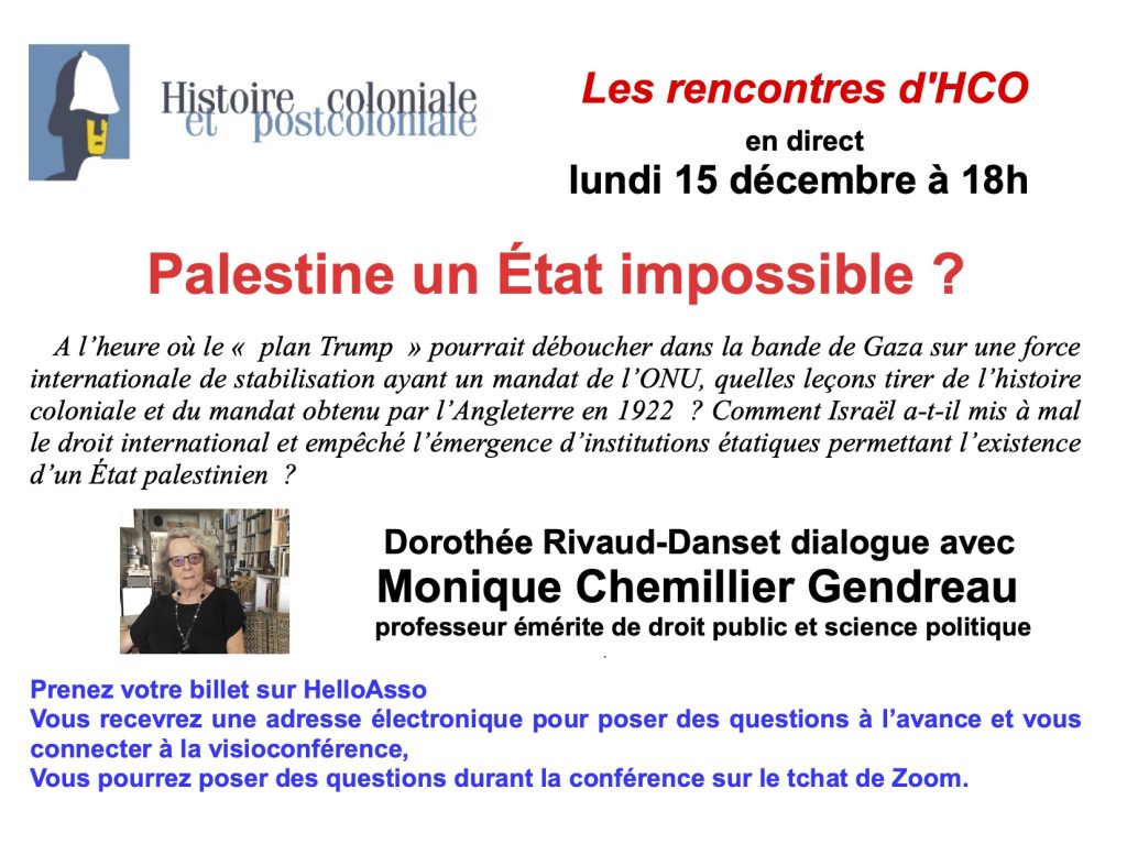 Pour leur deuxième édition, les Rencontres d’Histoire coloniale et postcoloniale recevront Monique Chemillier-Gendreau, en direct le 15 décembre à 18h, sur le thème « Palestine, un Etat impossible ». Dorothée Rivaud-Danset dialoguera avec Monique Chemillier-Gendreau, professeur émérite de droit public et science politique, qui répondra à vos questions. Ci-après, le lien pour prendre son billet et participer et poser vos question lors de la rencontre en visio.