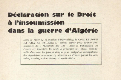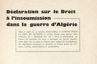 La protestation, peu audible durant les premières années, enfle. Les désastres sont sans nom pour le peuple algérien. La torture, subie par des dizaines de milliers, connue de tous, est désormais le quotidien pour ce peuple. En France, pour les familles, c’est chaque jour un peu plus de deuils, de peurs. La politique gaulliste souffle le chaud et le froid : promesse d’autodétermination mais poursuite et même accentuation de l’effort militaire. Les oppositions (PCF, le tout jeune PSU, les intellectuels contestataires) ne trouvent pas de langage commun – et à vrai dire ne le cherchent guère. Un certain sentiment d’impuissance s’est emparé des milieux les plus investis dans la lutte anti-guerre. Début 1960, c’est de l’entourage de Dionys Mascolo, communiste en rupture de ban (exclu du PCF dès 1950), que part l’idée d’un soutien public de personnalités aux soldats refusant de porter les armes en Algérie. Le texte, intitulé dans un premier temps Adresse à l’opinion internationale, co-rédigé par Mascolo et le surréaliste Jean Schuster, est soumis à un premier groupe. C’est Maurice Blanchot qui lui donne son titre définitif, Manifeste pour le droit à l’insoumission dans la guerre d’Algérie. En juillet, la première liste est prête. En septembre, le texte commence à circuler sous le manteau (la presse n’a pas le droit de le publier, la censure gaulliste sévit en ces temps-là). La première publication est faite par l’organe semi légal de la Centrale d’information et d’action sur le fascisme et la guerre d’Algérie, Vérités Pour, le 26 septembre 1960. Pour la postérité, il deviendra Manifeste des 121, tout simplement parce ce fut le chiffre des premiers signataires : « Nous respectons et jugeons justifié le refus de prendre les armes contre le peuple algérien. Nous respectons et jugeons justifiée la conduite des Français qui estiment de leur devoir d’apporter aide et protection aux Algériens opprimés au nom du peuple français. La cause du peuple algérien, qui contribue de façon décisive à ruiner le système colonial, est la cause de tous les hommes libres ». L’avaient signé certains des intellectuels les plus engagés contre la guerre, Robert Barrat, Simone de Beauvoir, Marguerite Duras, Pierre Boulez, André Breton, Édouard Glissant, Daniel Guérin, Jérôme Lindon, André Mandouze, Dionys Mascolo, François Maspero, Théodore Monod, Hélène Parmelin, Alain Resnais, Alfred Rosmer, Claude Roy, Nathalie Sarraute, Jean-Paul Sartre, Simone Signoret, Vercors, Jean-Pierre Vernant, Pierre Vidal-Naquet, etc.