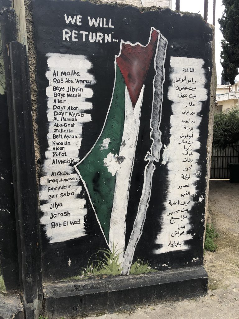 Accompagnant sa volonté de remise en cause de l’UNRWA (United nations relief and work agency for palestine refugees in the near east, créée en 1948), accusée à Gaza d’avoir fait travailler des Palestinien·nes du Hamas, le gouvernement d’Israël entend en finir avec les camps de réfugié·es eux mêmes. La clé, symbole de l’exigence palestinienne du droit au retour des réfugié·es est présente partout. Et ces camps constituent pour Israël, le symbole du refus des Palestinien·nes d’accepter leurs conditions de vie en occupation et de renoncer au droit au retour inscrit dans la résolution 194 de l’ONU en 1948.