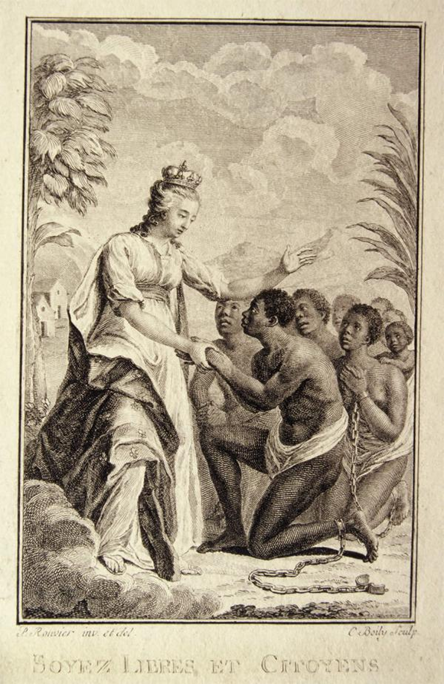 Pierre Rouvier & Charles Boily, « Soyez Libres et Citoyens », gravure, 14,7 cm x 9,6 cm in Benjamin-Sigismond Froissard, frontispice de La cause des esclaves nègres et des habitans de la Guinée […], Lyon, 1789.