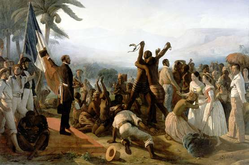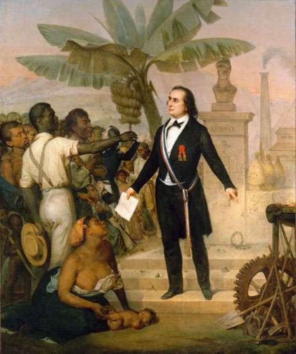 Rétabli sous Bonaparte par la loi du 30 Floréal An X (20 mai 1802), l’esclavage est définitivement aboli le 27 avril 1848 après qu’un décret du Gouvernement provisoire daté du 4 mars 1848 eut institué « une commission pour l’émancipation des esclaves dans toutes les colonies de la République ». Le principe de l’abolition de l’esclavage fut confirmé par la Constitution de la nouvelle République ainsi que l’application du suffrage universel masculin dans les colonies ce qui permit aux « nouveaux citoyens » de participer à l’élection des députés. Mais l’abolition était assortie de l’indemnisation des colons (article 5 du décret du 27 avril 1848). Victor Schœlcher qui présida la commission d’abolition de l’esclavage du 5 mars au 21 juillet 1848 fut mis en minorité lorsqu’il proposa d’indemniser les esclaves et de leur permettre d’avoir des terres. Par la loi du 30 avril 1849, les maîtres furent indemnisés pour la perte de leurs esclaves, y compris ceux qu’ils avaient acquis en toute illégalité[4]. « On mesure ainsi à quel point l’abolition de 1848, si elle est à l’actif de la République, est une régression par rapport à celle de 1794. Les premiers républicains insistaient sur le fait qu’on ne donnait pas de droits aux esclaves en les affranchissant, puisque ces droits, qu’on leur avait niés, ils en avaient toujours été détenteurs : on ne faisait que mettre fin à un crime (…) Avec la Deuxième République, il ne s’agit plus de cela, mais d’un affranchissement octroyé, qui prétend mettre les esclaves dans la position de recevoir un bienfait, tandis que les maîtres sont censés avoir consenti à un sacrifice pour lequel on leur reconnaît le droit à recevoir une indemnité[5]. »