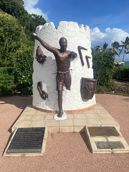 « Aux Antilles et à la Réunion, c’est le “nègre marron” qui est célébré. Il n’est plus considéré comme un marginal et il apparaît désormais comme un personnage valeureux qui a su fuir sa condition servile quoiqu’il lui en coûtât. Aux Antilles françaises, l’accent est ainsi mis sur les qualités exceptionnelles de celui qui n’a pas attendu l’abolition de l’esclavage. Les représentations insistent notamment sur sa force physique. La plupart des lieux de mémoire guadeloupéen et martiniquais font figurer en effet un homme robuste et puissant capable de briser ses liens grâce à sa force herculéenne. Les exemples caractéristiques ne manquent pas en particulier dans des communes très touristiques comme Le Diamant en Martinique et Sainte-Anne en Guadeloupe[11]. »